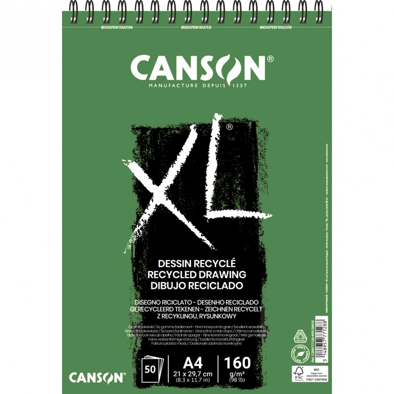 Cuaderno de dibujo A4 CANSON XL de papel blanco reciclado. 50 hojas de 160 gramos por metro cuadrado. Tapas duras. Encuadernado con alambre en el lado corto. Hojas microperforadas para arrancar con facilidad.