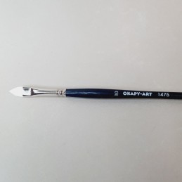 Pincel de fibra sintética con el mango corto y con forma lengua de gato. Un pincel económico para acrílico, óleo y témpera. El número 10 tiene un ancho de 9 milímetros y una longitud de fibra (salida) de 13 mm.