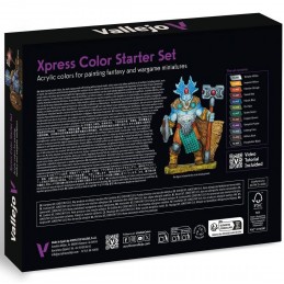 El kit incluye una figura ya montada e imprimada en blanco de 5 centímetros de alta, 12 botes de xpress color de 18 ml y un pincel para miniaturas. También tiene una pequeña guía con las fotografía del paso a paso. En nombre que viene en la caja es Xpress Color Starter Set. Vallejo es una prestigiosa marca de pintura acrílica para artistas, miniaturas, modelismo y el mundo Warhammer.
